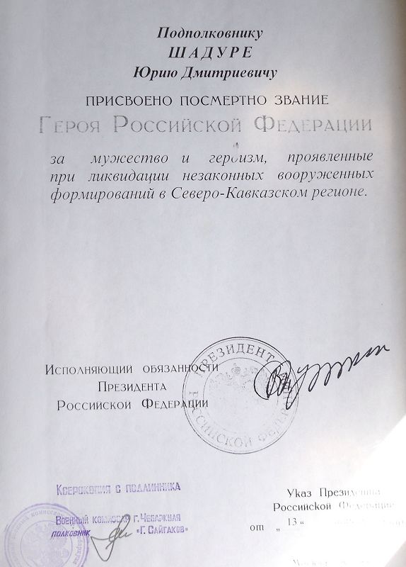 Фотокопия из личного дела Героя России Шадуры Юрия Дмитриевича (информация от военнго комиссара г. Чебаркуля полковника Г. Сайгакова, тоже выпускника вашего ВОКУ). Спасибо за понимание. С уважением, выпускник Киевского ВОКУ 1983 г.в. Загура Валентин Николаевич.